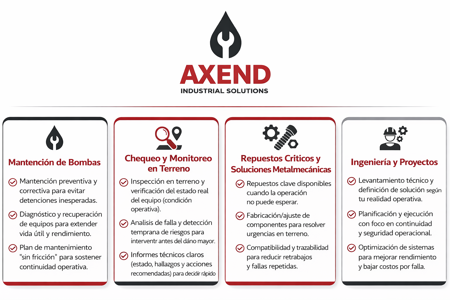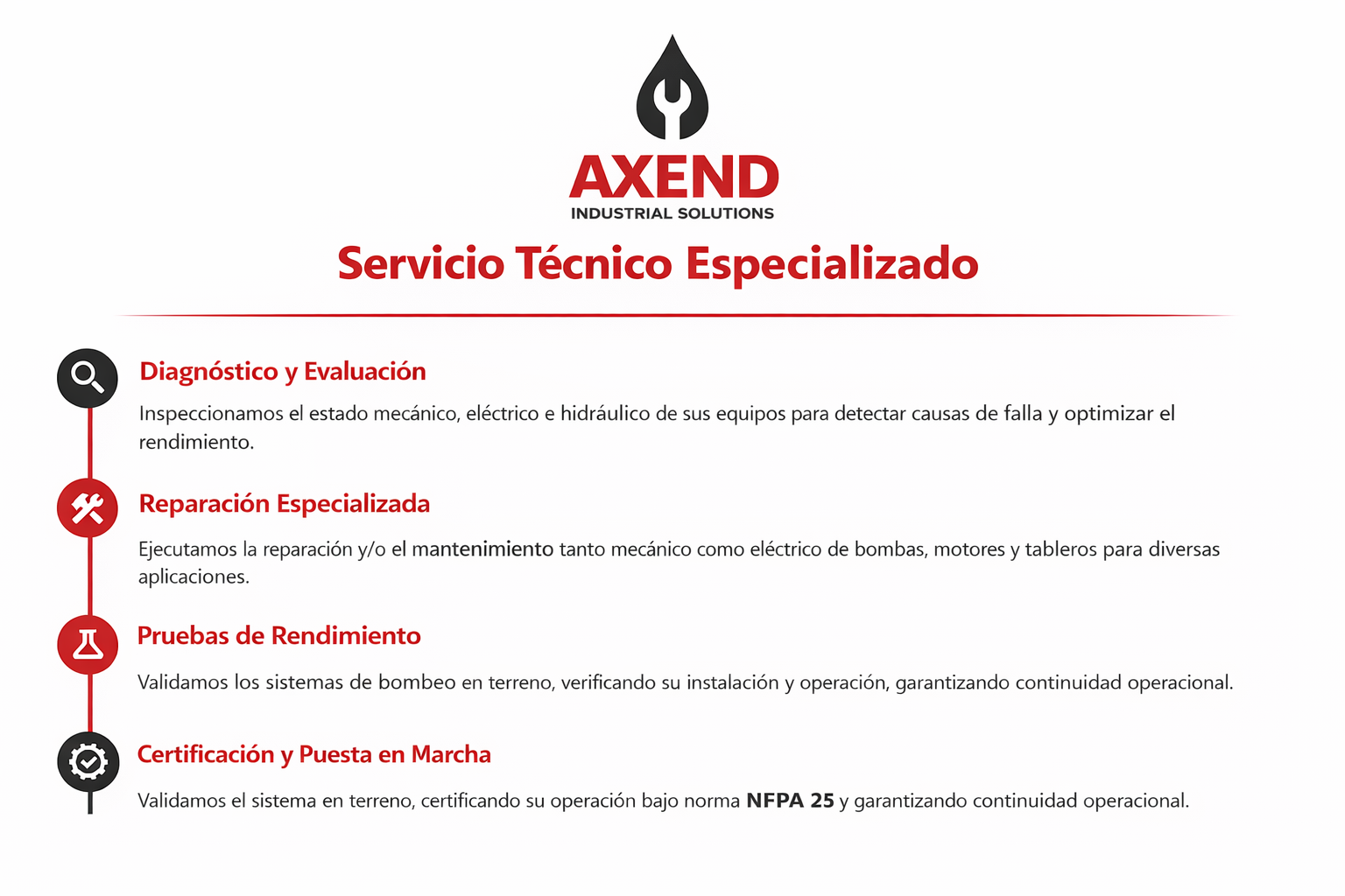 En AXEND Chile acompañamos cada etapa del ciclo técnico: diagnóstico, reparación, pruebas y certificación final. Un proceso diseñado para garantizar confiabilidad y eficiencia en cada sistema de bombeo.